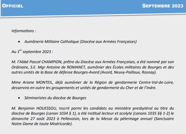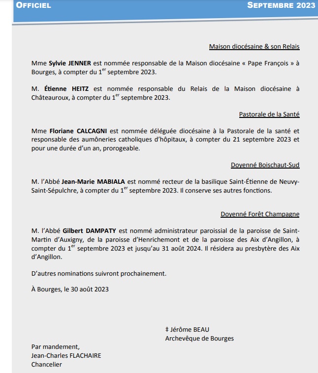 Accueil » Nos archives » Bourges : les nominations diocésaines En Une Bourges : les nominations diocésaines Des nominations diocésaines ont été publiées dans le numéro de septembre de la Vie diocésaine du Berry – le diocèse de Bourges recouvre les territoires du Cher et de l’Indre. D’autres nominations concernent le DAF et un séminariste : Article précédentAgenda: Prochaines retraites avec l’Oeuvre des Retraites de la Fraternité Saint-Pierre Article suivantSortie du film Sacerdoce 18 octobre 2023