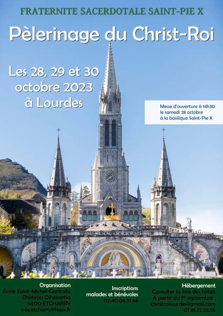 Comme chaque année, le pèlerinage international du Christ-Roi organisé par la Fraternité Saint-Pie X se déroulera à Lourdes du 28 au 30 octobre 2023.