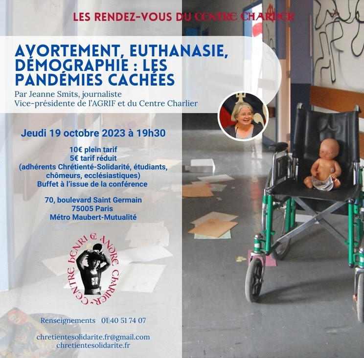 Dans le cadre du cycle de conférences 2023-2024 du Centre Charlier, Jeanne Smits viendra évoquer un sujet d’actualité : « Avortement, euthanasie, démographie : les pandémies cachées » le jeudi 19 octobre à 19h30 au Centre Charlier (Renseignements ci-dessous).
