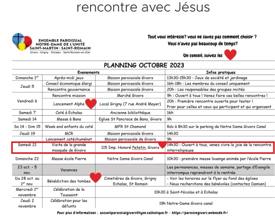 Le 21 octobre dernier, la paroisse de Givors, près de Lyon, dont le curé est Damien Guillot, organisait une « rencontre interreligieuse » à la mosquée. Elle était d’ailleurs dûment notée sur le planning paroissial, deux jours après le lancement du parcours catéchétique.
