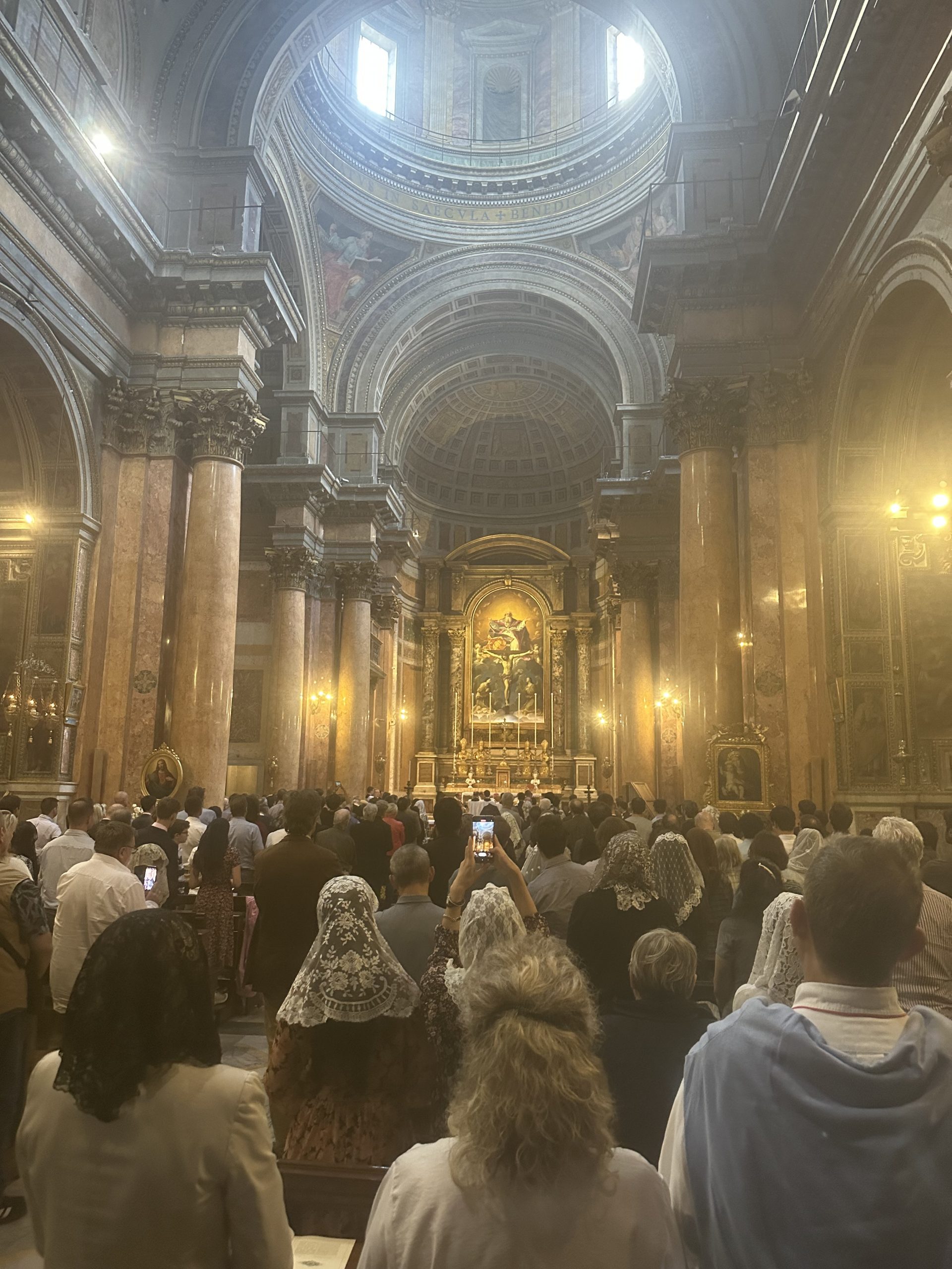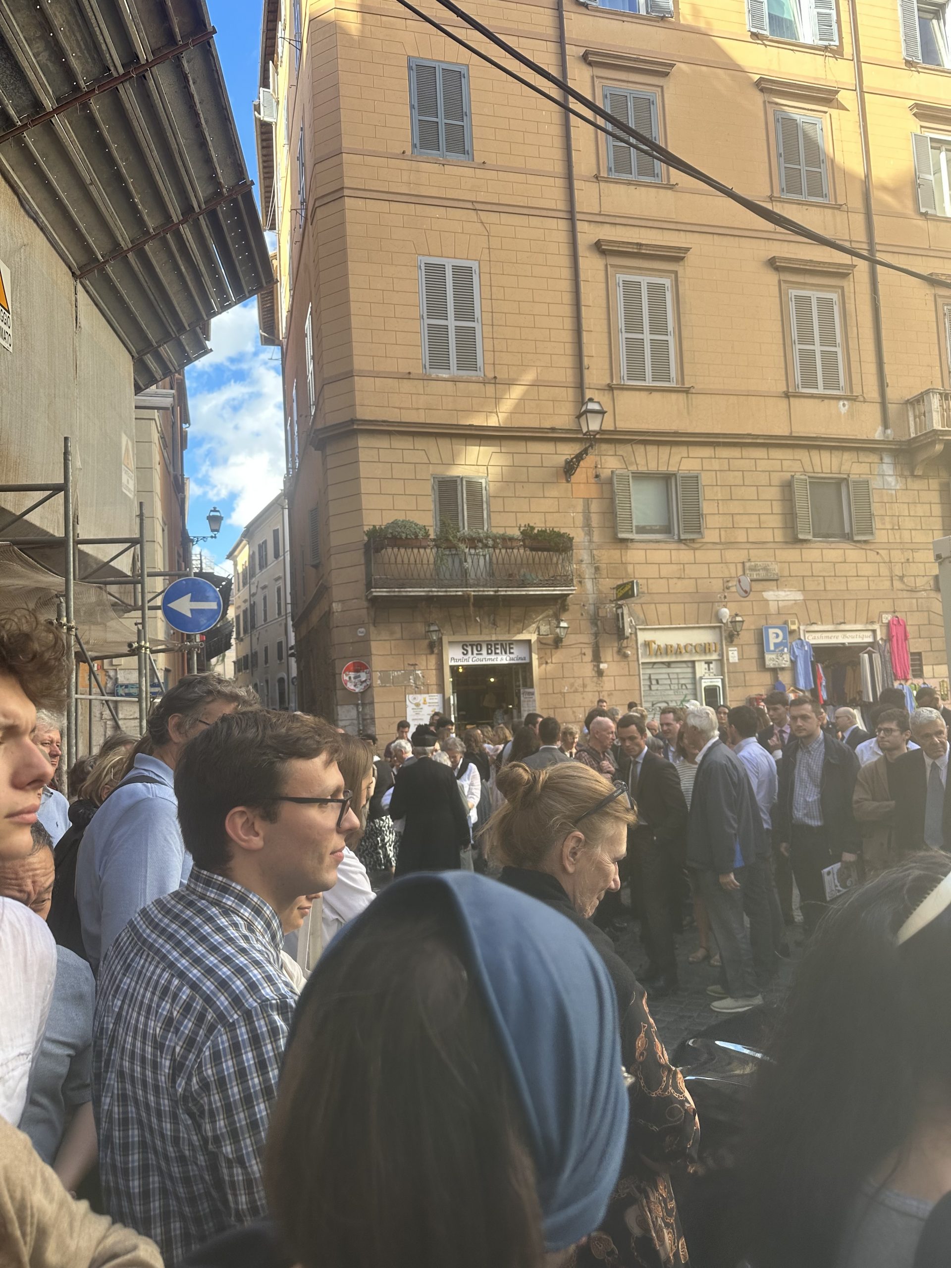 À la sortie de l’église, il y avait de nombreux pèlerins sur le parvis de la piazza della Trinita dei Pellegrini