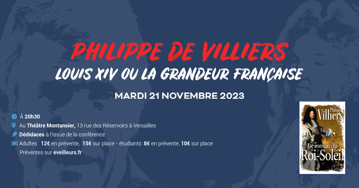 Les Éveilleurs invitent Philippe de Villiers à présenter son dernier roman « Le roman du Roi-Soleil » au Théatre Montansier à Versailles le mardi 21 novembre :