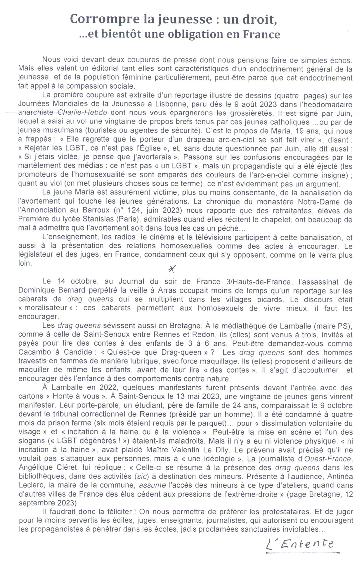 Le dernier numéro de L’Entente Catholique de Bretagne (n°255, Septembre – Octobre 2023) vient de paraître. L’éditorial évoque la corruption institutionnalisée de la jeunesse.