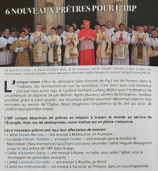 La lettre du séminaire de l’institut du Bon Pasteur à Courtalain d’octobre indique les affections des six nouveaux prêtres ordonnés en juin dernier – en Italie (l’IBP est présent à Rome, dans les diocèses suburbicaires, dans les Marches…), Pologne (4 implantations dont Varsovie), États-Unis, Brésil et encore Australie.
