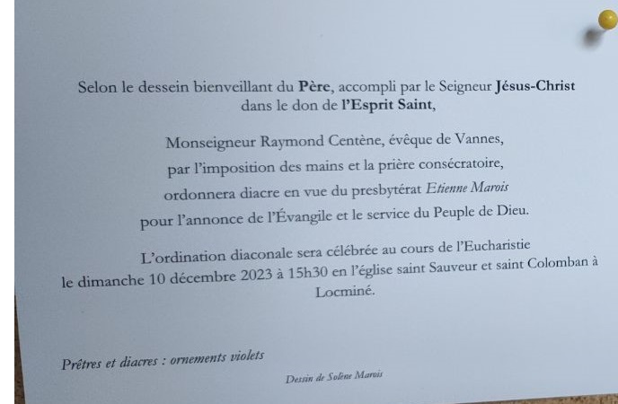 Actuellement en insertion à la paroisse de Ploemeur après avoir été formé à la maison des séminaires de Fribourg (qui regroupe les séminaristes des diocèses de Sion, Lausanne-Genève-Fribourg et quelques séminaristes français), Etienne Marois va être ordonné diacre en vue du sacerdoce ce 10 décembre après la messe en l’église de Locminé, dans le Morbihan.