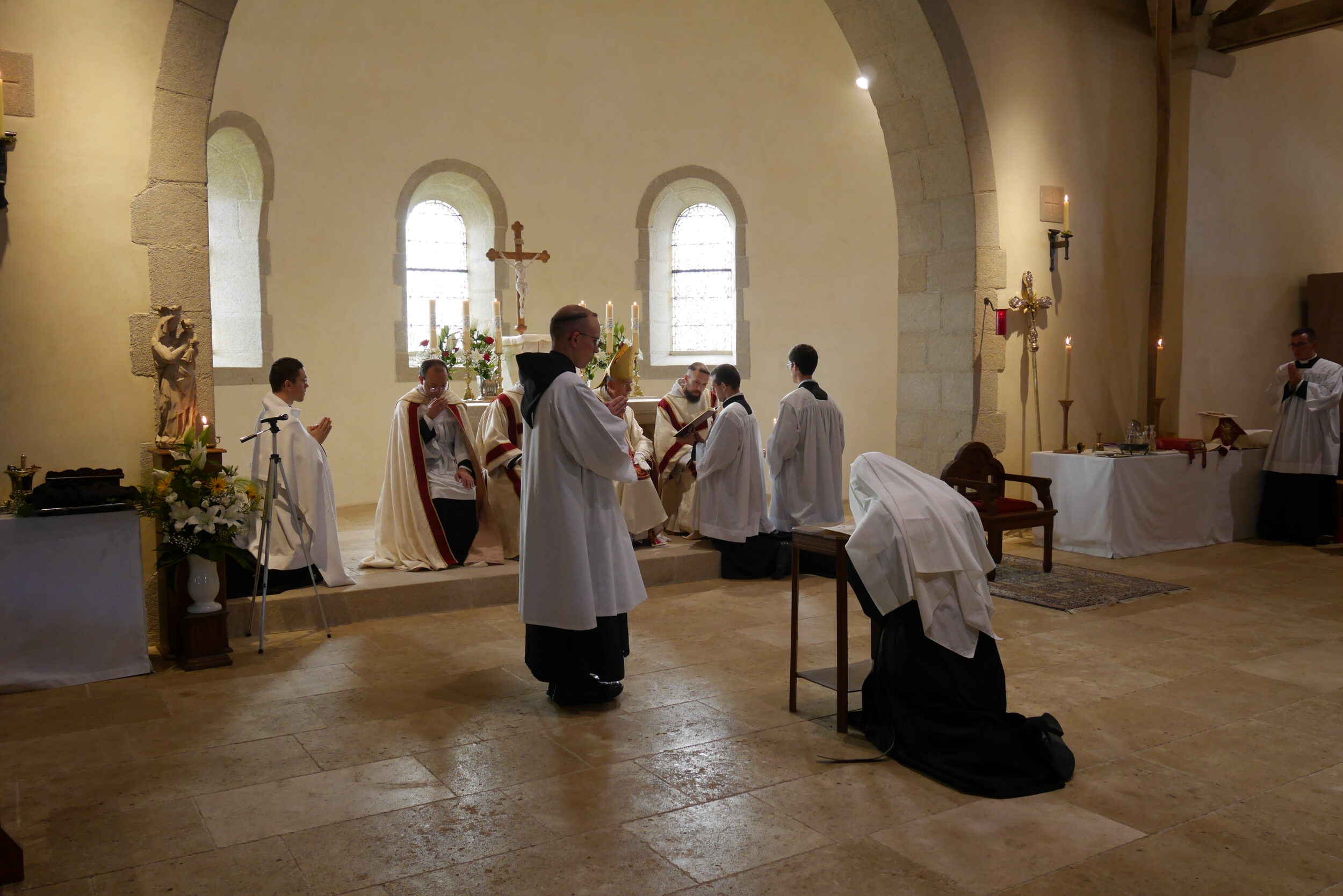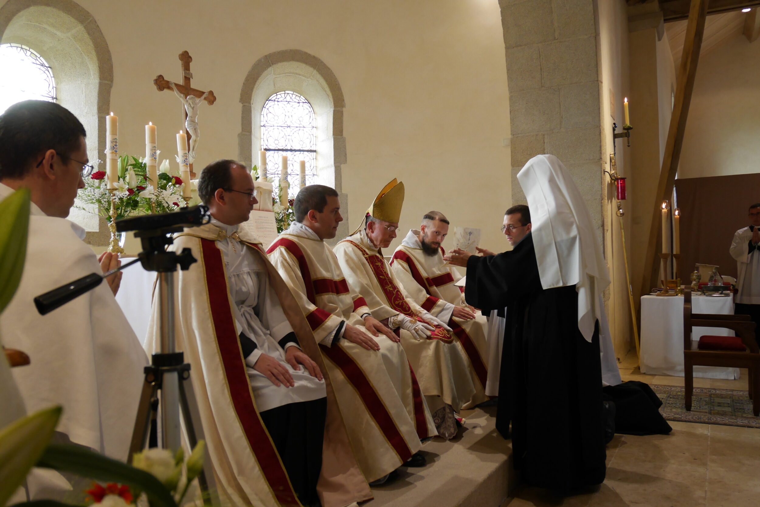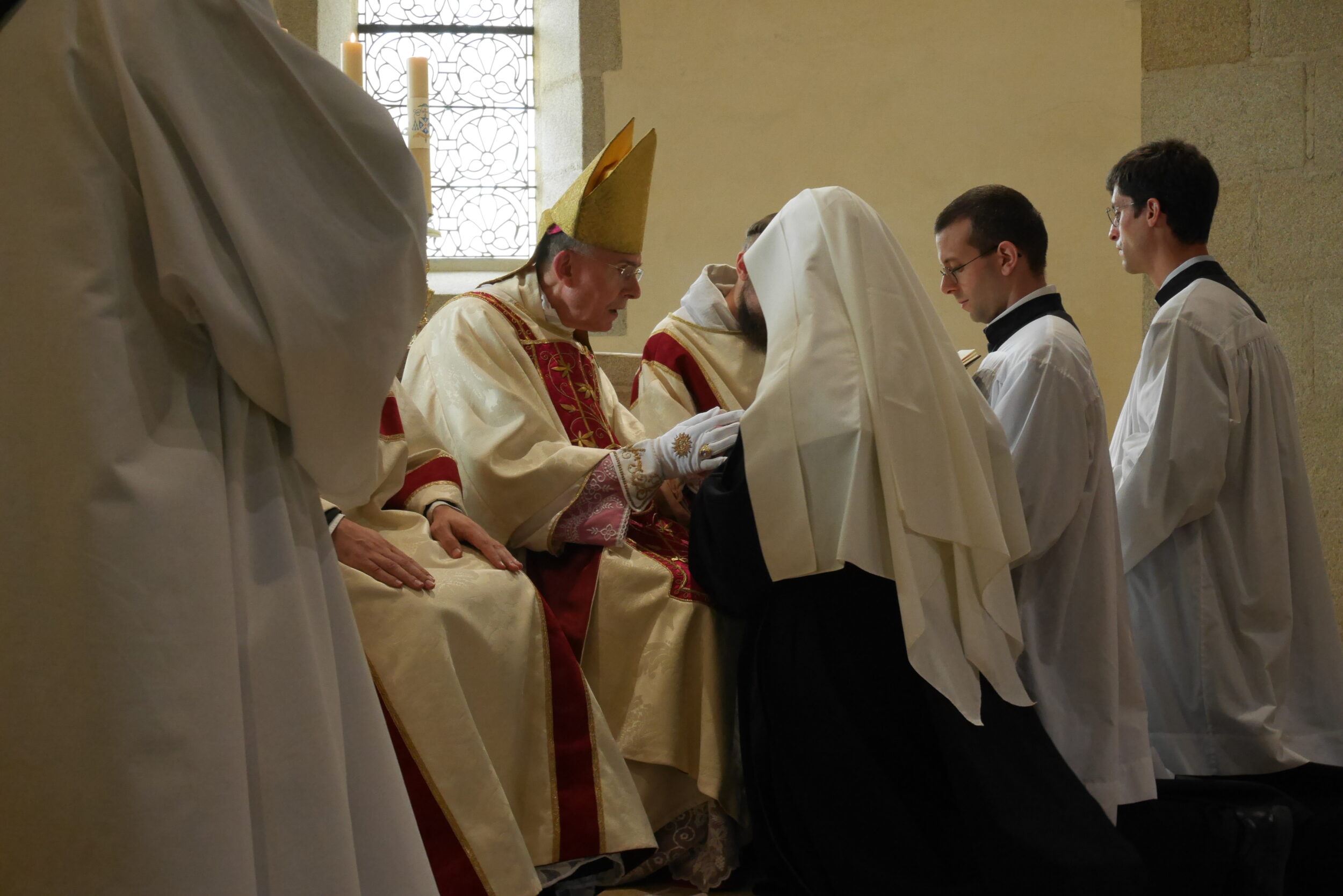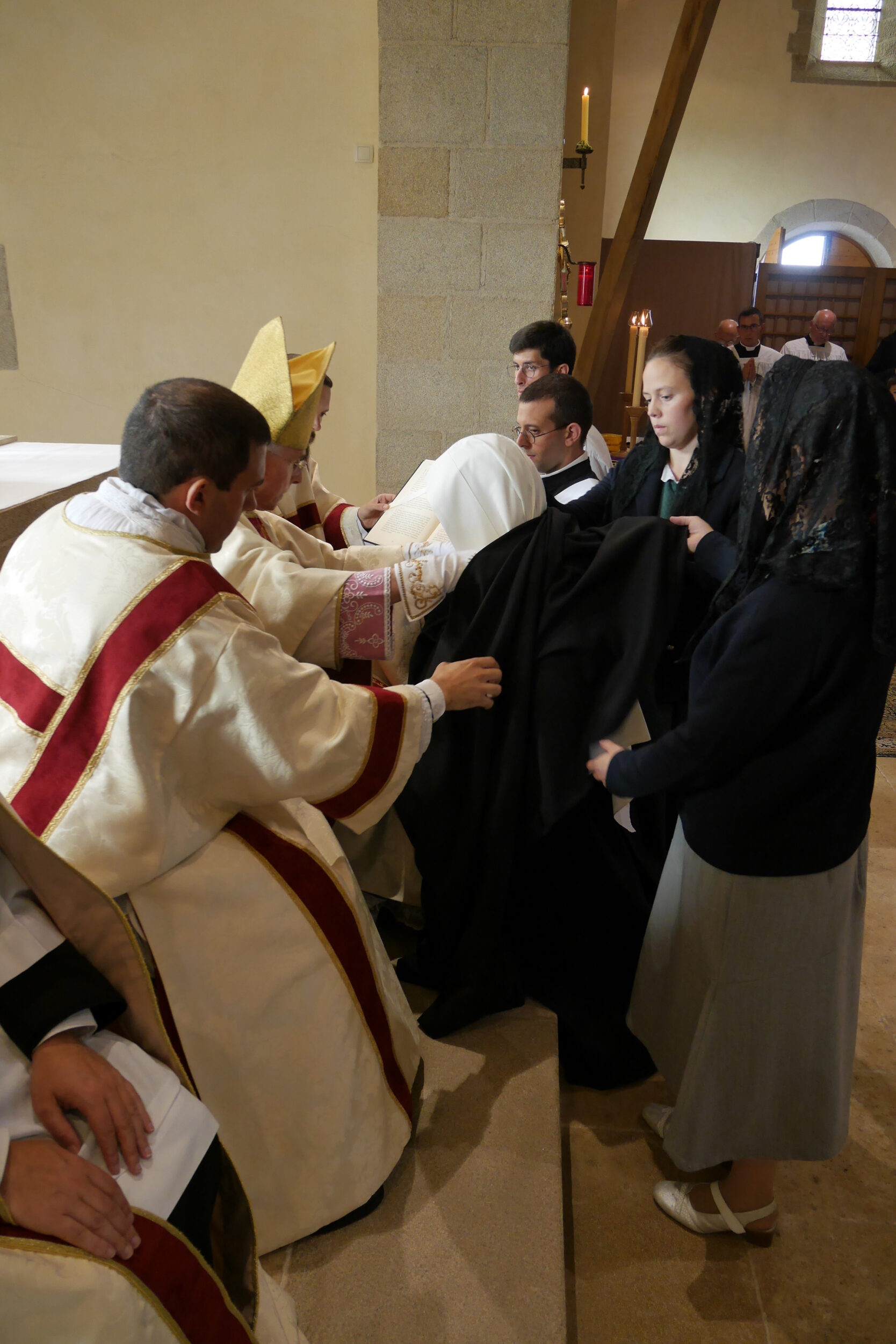 Comme on peut le voir, les Vierges sont appelées par l’évêque, lisent leur charte de profession et se prosternent au cours de la litanie des saints.