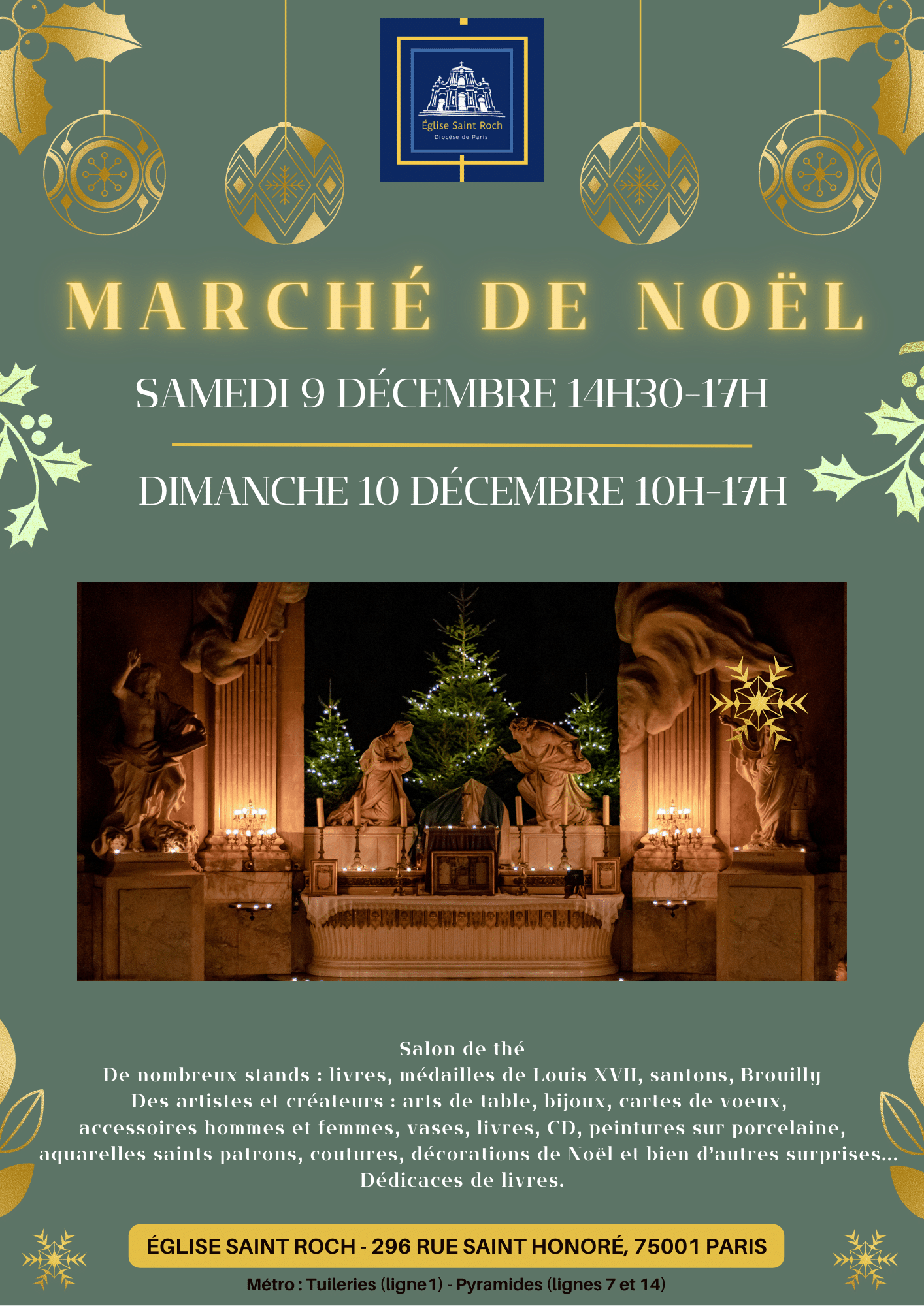 Accueil » Nos archives » Marché de Noël 2023 : Paroisse Saint-Roch (Paris) les 9 et 10 décembre Summorum Pontificum Marché de Noël 2023 : Paroisse Saint-Roch (Paris) les 9 et 10 décembre La Paroisse Saint-Roch (Paris) nous invite à son Marché de Noël le samedi 9 et dimanche 10 décembre : Paroisse Saint-Roch (Paris) Article précédentNotre-Dame de Chrétienté veut pouvoir accueillir plus de pèlerins Article suivantVannes : une ordination diaconale en vue du sacerdoce 8 décembre 2023