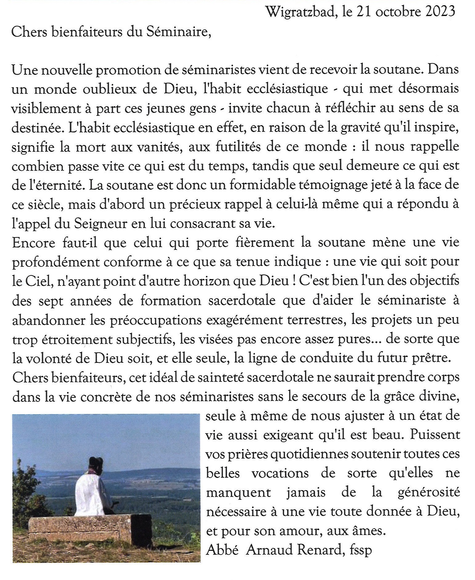 Le Séminaire Saint-Pierre (Séminaire de la Fraternité Saint-Pierre en Europe) publie une lettre, les Amis du Séminaire Saint-Pierre, dont nous vous proposons l’éditorial de celle d’octobre 2023 de l’abbé Arnaud Renard, FSSP, professeur :