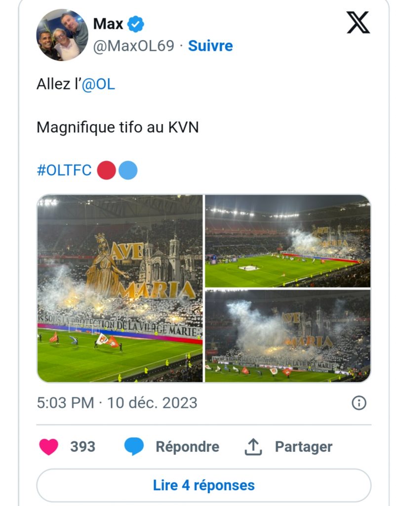Lors du match contre Toulouse, deux jours après le 8 décembre et la fête de l’Immaculée Conception, les supporters de l’Olympique Lyonnais se sont fendus d’un tifo magnifique avec la sainte Vierge, Fourvière et une banderole « Lyon à jamais sous la protection de la Vierge Marie« .