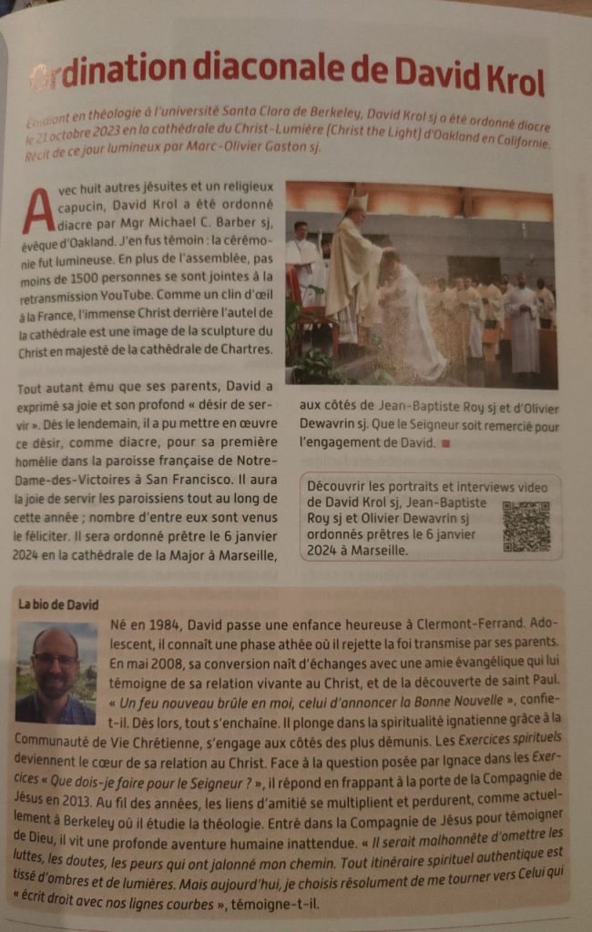 L’on apprend du bulletin Jésuites, édition décembre, que David Krol, auvergnat d’origine, entré dans la compagnie de Jésus en 2013 et étudiant en théologie à Berkeley, a été ordonné diacre à Oakland en Californie le 21 octobre dernier avec huit autres jésuites et un capucin. Le 6 janvier prochain, à la cathédrale de la Major à Marseille, il sera ordonné prêtre jésuite, avec Jean-Baptiste Roy, vendéen d’origine, issu des communautés Foi et Lumière, puis directeur de supermarché à Paris avant de faire le chemin de Compostelle puis entrer chez les jésuites, et Olivier Dewavrin, ordonné diacre avec sept autres séminaristes jésuites d’origine étrangère en l’église Saint-Ignace de Paris, le 13 mai dernier.