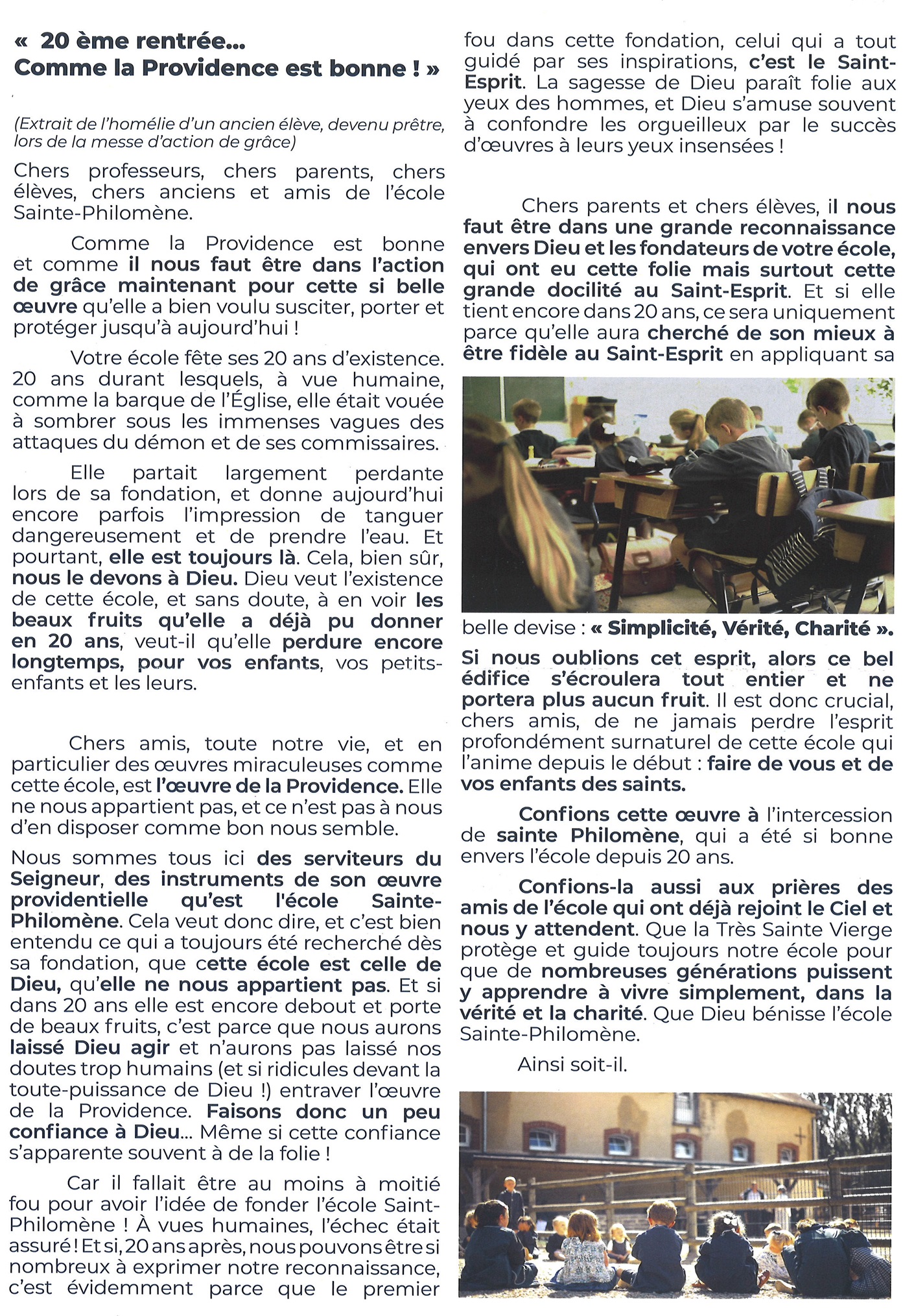 Accueil » Nos archives » L’Ecole Sainte-Philomène (Rennes) fête ses 20 ans Summorum Pontificum L’Ecole Sainte-Philomène (Rennes) fête ses 20 ans L’école Sainte Philomène a été fondée à Rennes par un groupe de parents en 2003. Elle compte aujourd’hui plus de 200 élèves de la maternelle à la 3è. Dans sa dernière lettre, l’école évoque le 20è anniversaire de sa création : Soutenir l’Ecole Sainte Philomène Article précédentFiducia supplicans : déclaration des évêques du Cameroun Article suivantDiocèse de Digne : une prière à Mgr de Miollis 22 décembre 2023