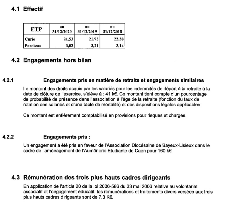 Les effectifs du diocèse sont indiqués, en 2020, en ETP : exactement 21.53 pour la curie et 3.03 pour les paroisses. La même page indique la somme des « rémunérations et traitements » versés aux « trois plus hauts cadres dirigeants » : 7300 euros l’année pour les trois.