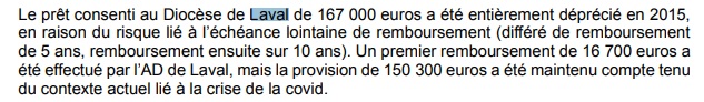 La situation financière est plutôt bonne : les comptes 2022 laissent apparaître 12,5 millions d’euros de réserves, un résultat d’exploitation positif (485 134 euros en 2022, 364 160 euros en 2021), un résultat de 600 000 euros avant impôts sur les deux ans (620 000 euros en 2020), 2.5 millions d’euros perçus en quêtes, denier du culte et dons (dont 1,3 millions d’euros à travers le denier du culte), 1 million en legs et les assurances vie (760 000 en 2021), 31 paroisses, un sanctuaire (Pontmain) et une maison diocésaine rénovée à grands frais en 2014-2015 avec 6,3 millions d’euros injectés. A l’époque, le diocèse de Luçon avait prêté 167.000 euros au diocèse de Laval, mais l’avait entièrement déprécié, ce qui apparaît dans ses comptes en 2019, notamment en raison de la longue durée du remboursement, entamé en 2019 – ce qui est mentionnée dans les comptes de l’A.D de Luçon cette année.