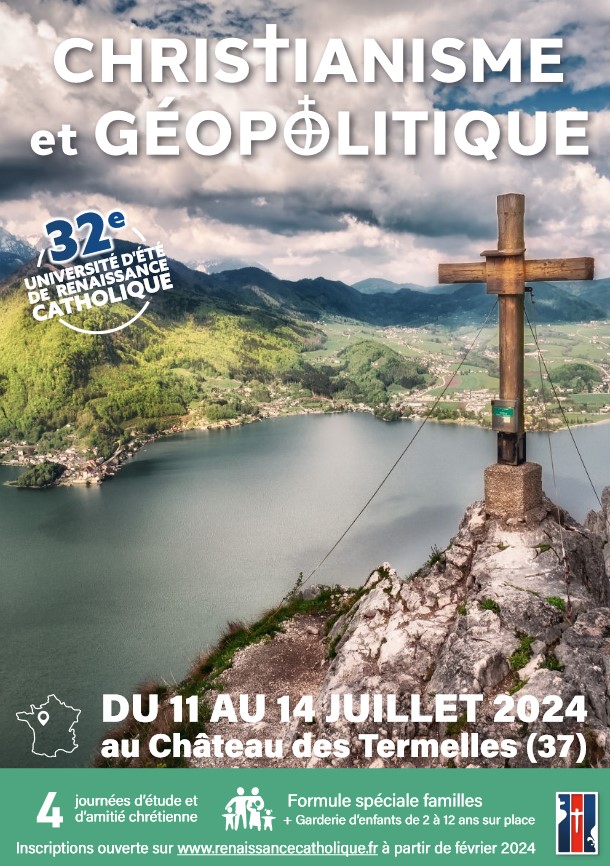 Accueil » Nos archives » Agenda : Université d’été de Renaissance Catholique Summorum Pontificum Agenda : Université d’été de Renaissance Catholique La 32ème université d’été de Renaissance Catholique se déroulera au Château des Termelles à Abilly (37) du 11 au 14 juillet 2024, sur le thème « Christianisme et géopolitique ». Renaissance Catholique Article précédentDiocèse de Strasbourg : l'enquête pénale sur Mgr Grallet classée pour prescription Article suivantDécouvrir Saint Thomas d’Aquin 18 janvier 2024