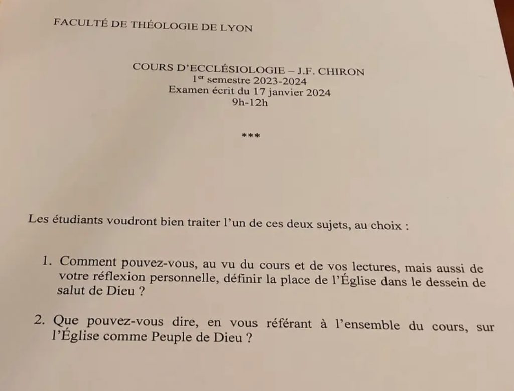 Accueil » Nos archives » Examens au séminaire de Lyon Non classifié(e) Examens au séminaire de Lyon Le séminaire Saint Irénée de Lyon a mis en ligne l’un des sujets des examens des étudiants, en cours d’ecclesiologie. Vous avez trois heures : Article précédentAbus à Betharram : Mgr Aillet communique Article suivantNew York: une messe de réparation après un hommage sacrilège à la cathédrale 18 février 2024