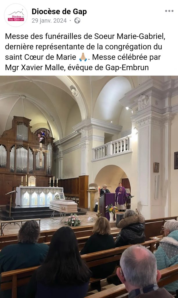 Avec le rappel à Dieu le 23 janvier 2024 de la dernière religieuse du saint Cœur de Marie à Gap, soeur Marie-Gabriel, dont la messe de funérailles a été célébrée ce 29 janvier à Gap, la congrégation du saint Cœur de Marie de Gap a complètement disparu.