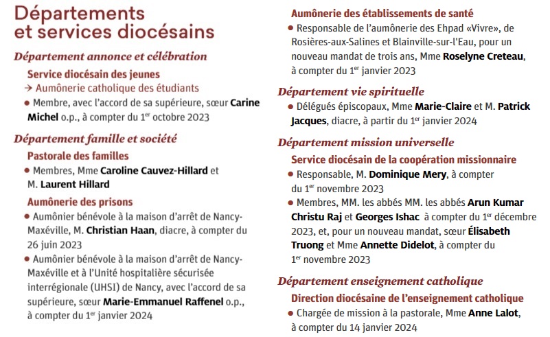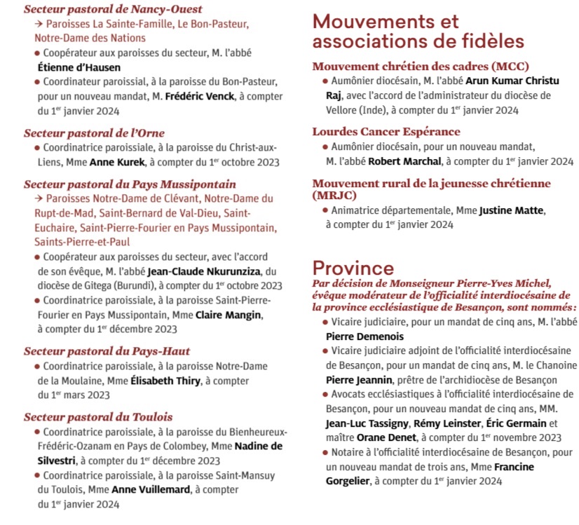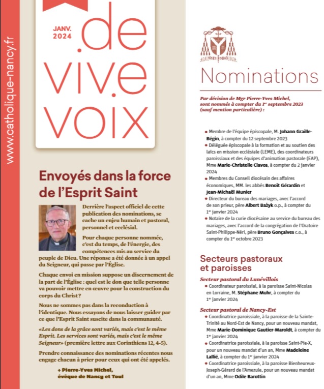 Voici les nominations du diocèse de Nancy, parues en janvier. Nous avons déjà publié l’encadrement des ventes de biens immobiliers par le nouvel évêque de Nancy, suite à l’enquête de Paix Liturgique sur le suicide comptable et spirituel du diocèse et les dérives constatées dans la mise en vente du patrimoine religieux.
