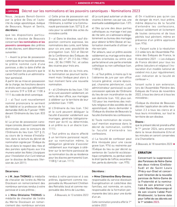 Par ailleurs le 18 novembre 2023 Mgr Benoit-Gonnin a pris un décret sur les pouvoirs canoniques des prêtres et décerné plusieurs distinctions :
