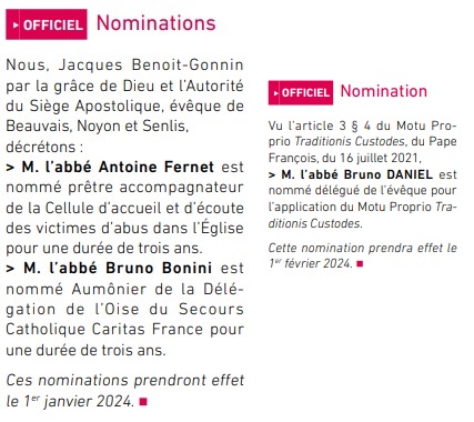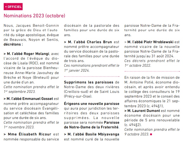 En complément des nominations de cet été, d’autres sont parues en novembre, janvier et février pour le diocèse de Beauvais, dans l’Oise.
