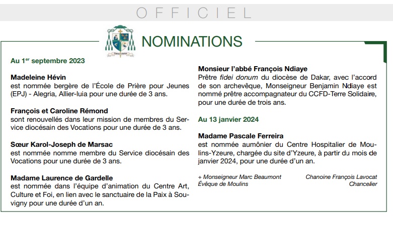 Accueil » Nos archives » Moulins (03) : nominations diocésaines complémentaires Informations Moulins (03) : nominations diocésaines complémentaires En complément des nominations parues cet été, d’autres ont été publiées dans le bimestriel diocésain en janvier 2024 : Article précédentEmission Terres de Mission (n°352, 3 mars 2024) Article suivantTonsures et ordres mineurs à Ecône 4 mars 2024