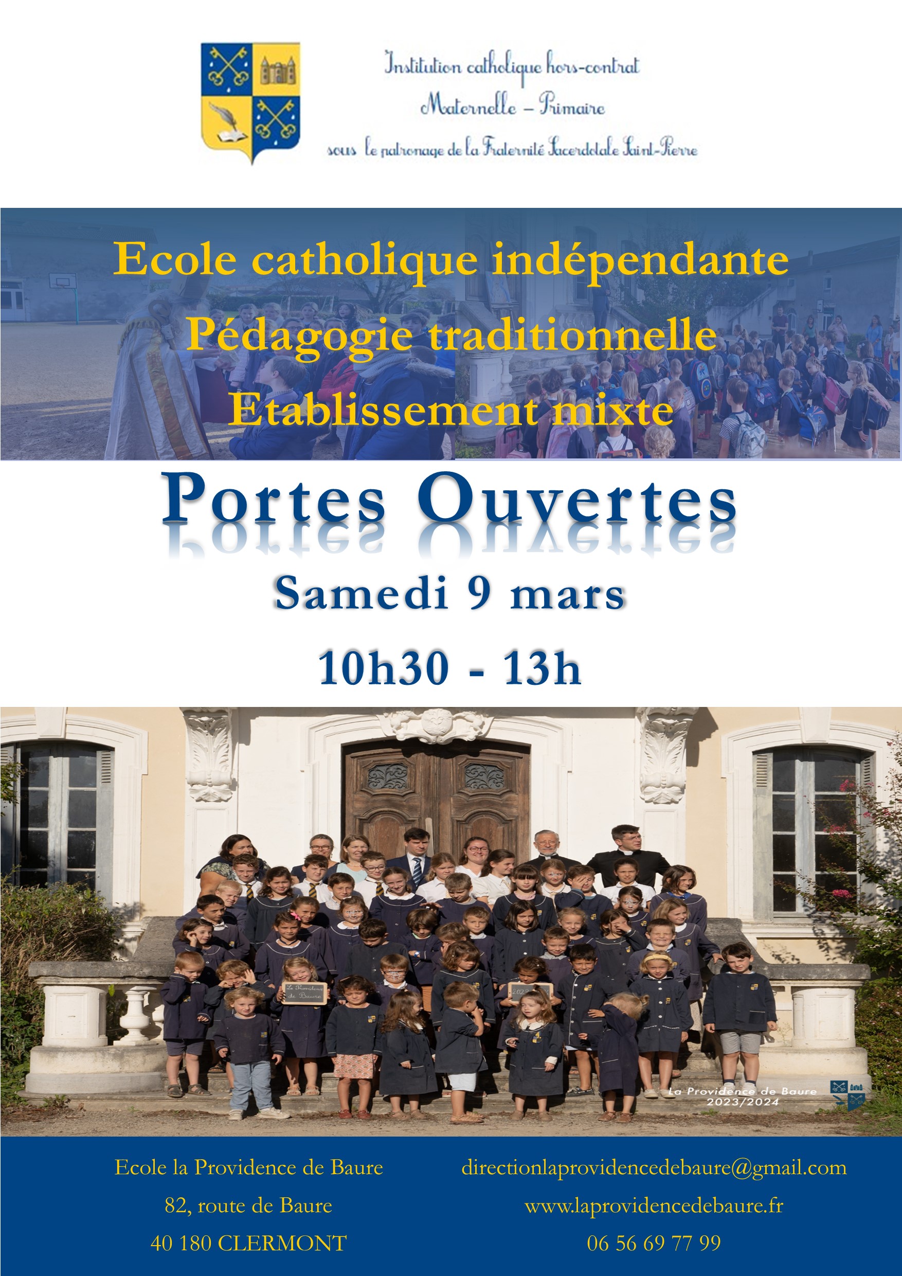 L’Ecole de la Providence de Baure est une école paroissiale fondée en 1962 par l’abbé Noël Tibur, alors curé de la paroisse de Clermont en Chalosse (40) qui compte aujourd’hui une cinquantaine d’élèves. L’établissement a ouvert un collège avec une classe de 6ème en septembre 2023. L’aumônerie est assurée par des prêtres de la Fraternité Saint-Pierre.