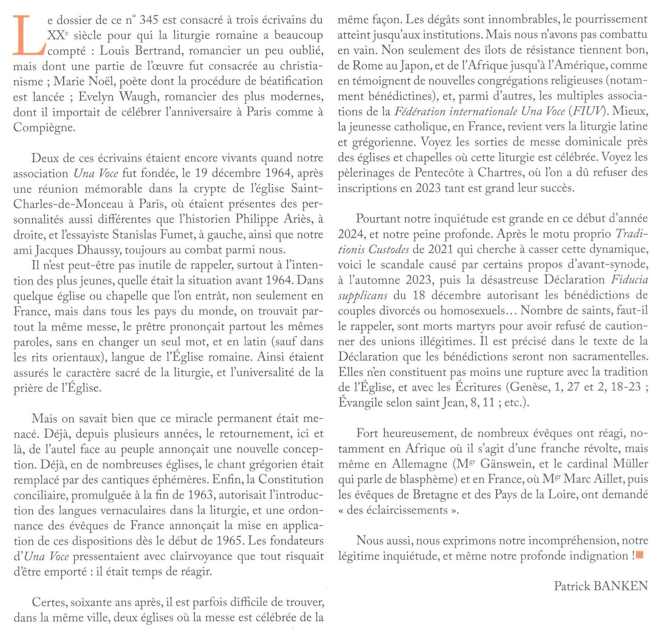 Au sommaire du numéro 345 de la revue Una Voce (Janvier-Février 2024), on peut lire différents articles d’actualité (« Mgr Rey ne démissionne pas », la déclaration Fiducia supplicans, …) un dossier sur les écrivains et la liturgie (« Louis Bertrand et la liturgie latine », « lettres de Marie Noël à l’abbé Mugnier » ou encore « les 120 ans d’Evelyn Waugh »), ainsi que la suite d’un article sur l’éducation à la liurgie.