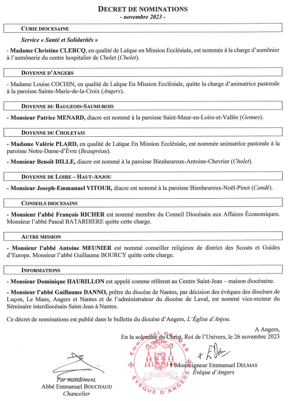 – Monsieur l’abbé Olivier BESSOU, prêtre du diocèse de Lokossa (Bénin), avec l’accord de Monseigneur Coffi Roger ANOUMOU son évêque, est nommé vicaire des paroisses Notre-Dame-d’Èvre (Beaupréau), Saint-Joseph-en-Mauges (Saint-Pierre-Montlimart), L’Espérance-au-Cœur-des-Mauges (Jallais), Sainte-Cécile-de-Loire-et-Divatte (Saint-Laurent-des-Autels), Saint-Benoît-en-Val-de-Moine (Saint-Macaire-en-Mauges) et Saint-Maurice-en-Val-de-Moine (Saint-Germain-sur-Moine) au 1er décembre 2023.