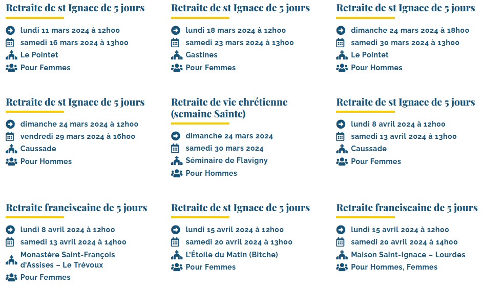 Accueil » Nos archives » Retraites avec la Fraternité Saint-Pie X Summorum Pontificum Retraites avec la Fraternité Saint-Pie X La Fraternité Saint-Pie X propose différentes retraites spirituelles pour hommes et femmes tout au long de l’année. Prochaines dates : Page des retraites (via La porte Latine) Article précédentTroyes : la maison diocésaine vendue à la Ville Article suivantNancy : les nominations diocésaines 25 février 2024