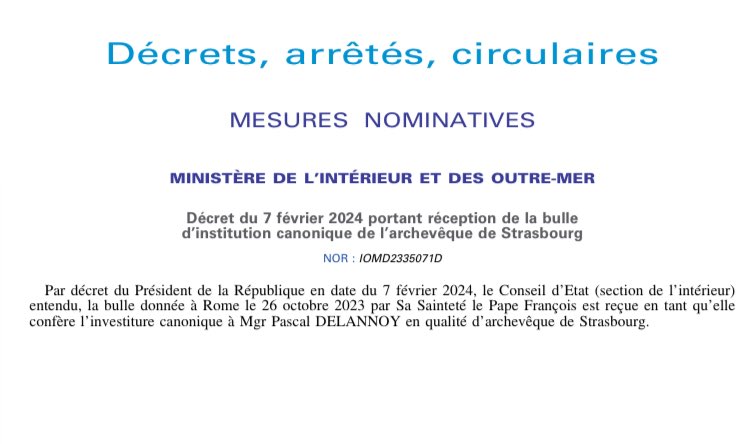 La bulle qui avait conféré l’investiture canonique à Mgr Delannoy en qualité d’archevêque de Strasbourg, a été reçue par décret du président de la République daté du 7 février 2024 et publié au Journal officiel du 28 février 2024.