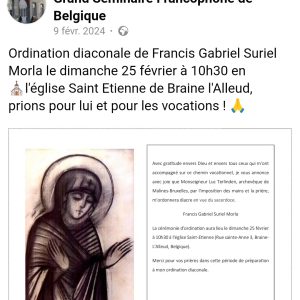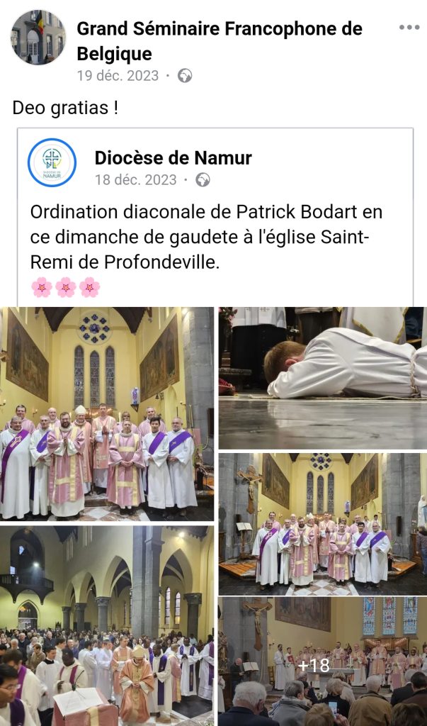 Par ailleurs un séminariste du diocèse de Namur, Patrick Bodart a été ordonné diacre en vue du sacerdoce, mi-décembre 2023.