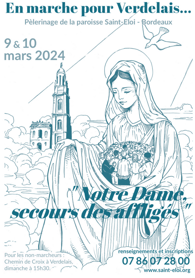 La Paroisse Saint-Eloi de Bordeaux propose un Pèlerinage vers Notre-Dame de Verdelais les samedi 9 et dimanche 10 mars 2024. Le pèlerinage a pour thème « Notre-Dame, secours des affligés » et sera accompagné par les prêtres de la paroisse (Institut du Bon Pasteur).