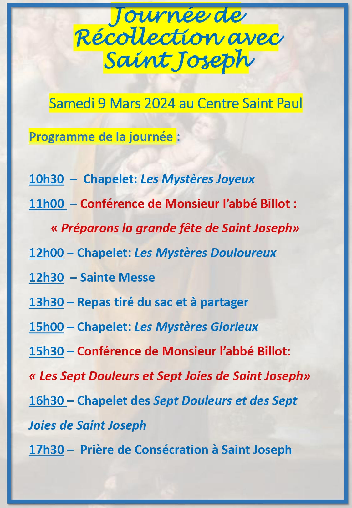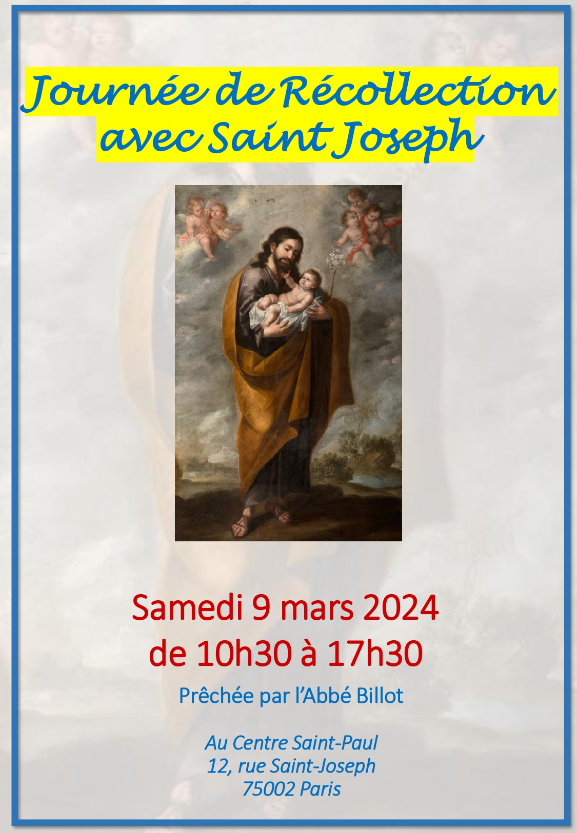 Accueil » Nos archives » Récollection avec Saint Joseph au Centre Saint-Paul (Paris) le samedi 9 mars Summorum Pontificum Récollection avec Saint Joseph au Centre Saint-Paul (Paris) le samedi 9 mars Le Centre Saint-Paul (12 rue Saint Joseph – 75002 Paris) propose une récollection avec Saint Joseph ce samedi 9 mars Centre Saint Paul (Facebook) Article précédentSaint Thomas d'Aquin et l'économie Article suivantBordeaux : un nouveau logo pour le diocèse 7 mars 2024