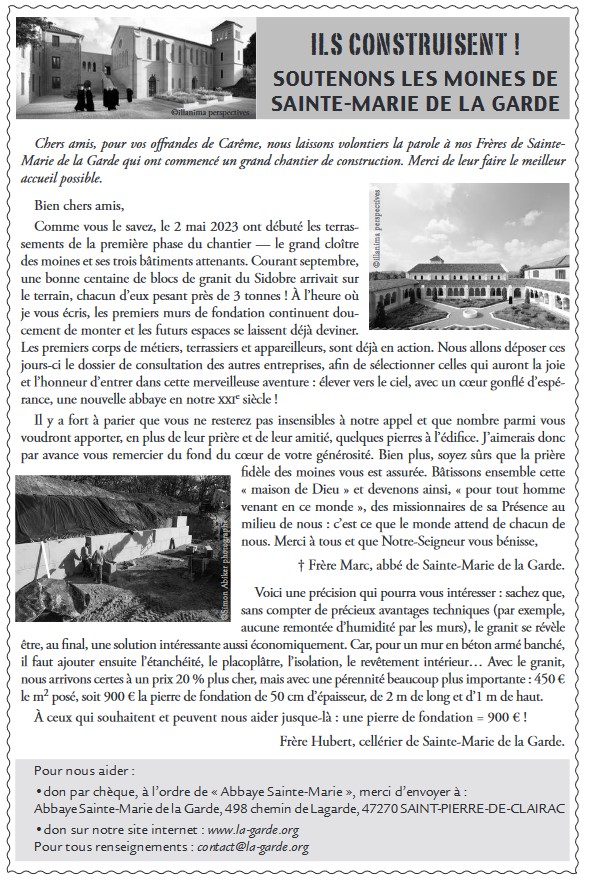 Accueil » Nos archives » Soutenir Sainte-Marie de la Garde ! Summorum Pontificum Soutenir Sainte-Marie de la Garde ! Fondée en 2002 par l’abbaye Sainte Madeleine du Barroux et érigée en abbaye en 2021, l’abbaye Sainte Marie de la Garde a lancé son chantier de construction. La dernière lettre aux amis du Barroux fait échos de ce grand chantier : Abbaye Sainte Marie de la Garde (Saint-Pierrre de Clairac) Article précédentFiducia Supplicans : première bénédiction d'un couple homosexuel en Uruguay Article suivantChrétiens attaqués après un chapelet à Metz : le chanoine Thiry dans le déni 11 mars 2024