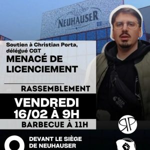 L’un de ces gardés à vue, selon nos informations, est un délégué CGT membre de Révolution Permanente, une scission du NPA (trotskistes). Figure locale – et donc, comme le précise son profil Facebook, personnalité politique – Christian Porta s’est fait connaître pour avoir été l’âme de la grève chez Neuhauser ces dernières semaines, et par la persécution de la direction à son égard (mis à pied le 7 février, interdit de site jusqu’à ce que l’entreprise soit déboutée au tribunal le 16 février, accompagné depuis en permanence par trois huissiers qui se relaient sur le site pour surveiller ses moindres faits et gestes, ce qui engendre des dizaines de milliers d’euros de frais pour l’usine… alors que la grève est liée à un refus d’augmenter les salaires), il est aussi menacé de licenciement après avoir été accusé par sa direction de « harcèlement moral« .