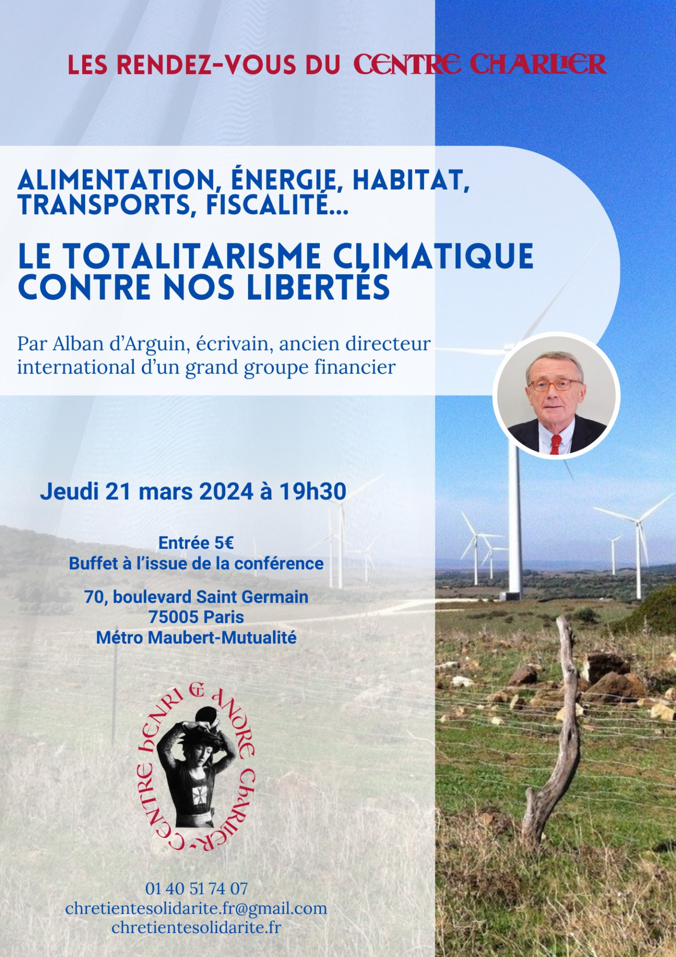 Dans le cadre du cycle de conférences 2023-2024 du Centre Charlier, Jeanne Smits viendra évoquer un sujet d’actualité : “Le totalitarisme climatique contre nos libertés » par Alban d’Arguin le jeudi 21 mars à 19h30 au Centre Charlier (Renseignements ci-dessous).