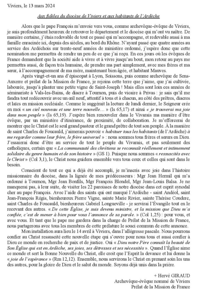 Il a écrit une lettre aux Ardéchois où il se place sous le patronage des saints ardéchois…mais aussi dans la lignée de ses prédécesseurs depuis le Concile…qui ont contribué à transformer l’un des diocèses français les plus fertiles en vocations religieuses, sacerdotales et missionnaires en désert de sel.