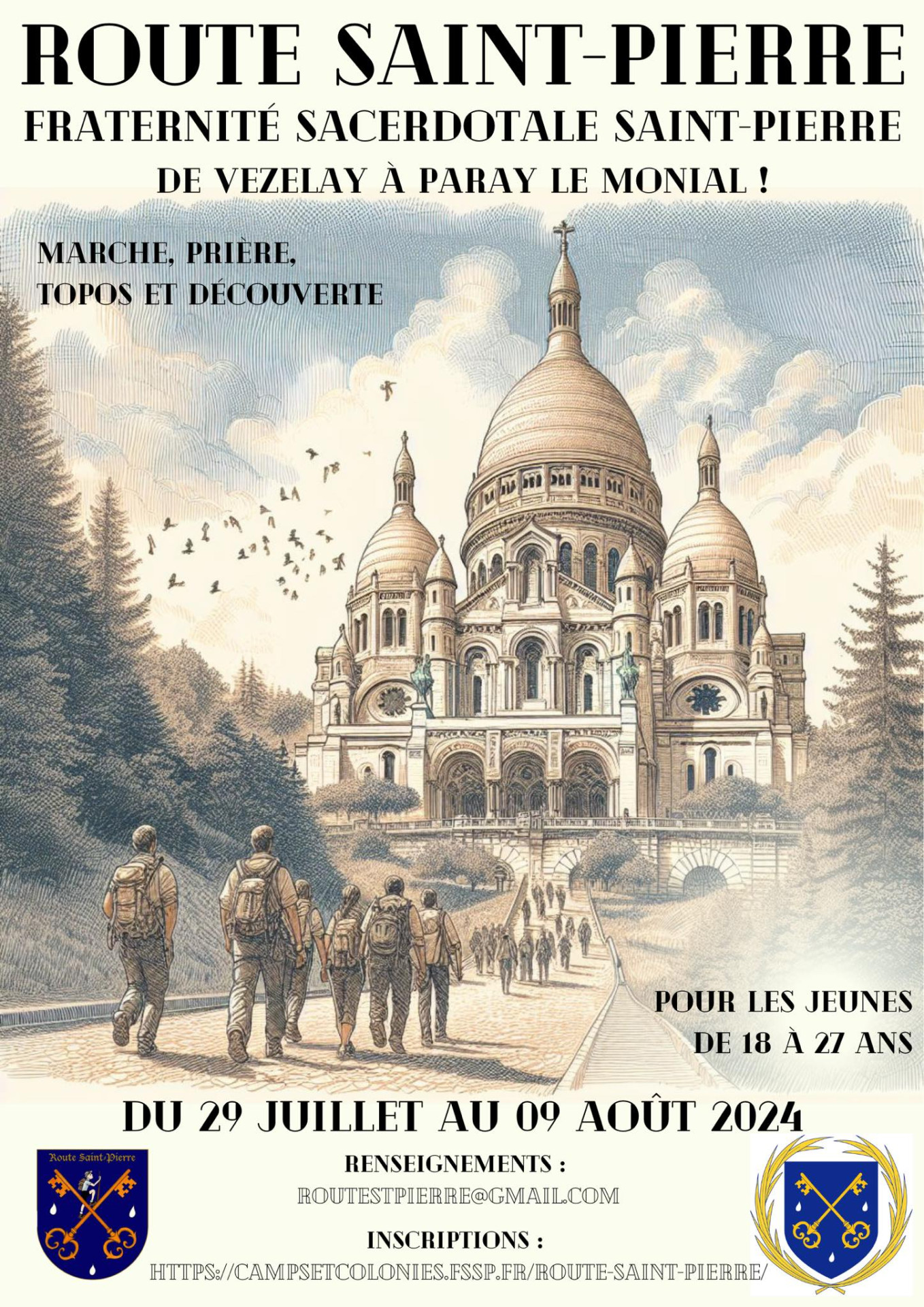 La Route Saint-Pierre, encadrée par des prêtres et séminaristes de la Fraternité Saint-Pierre, aura lieu du 29 juillet au 9 août 2024 de Vézelay à Paray le Monial. Elle est proposée pour les jeunes de 18 à 27 ans.