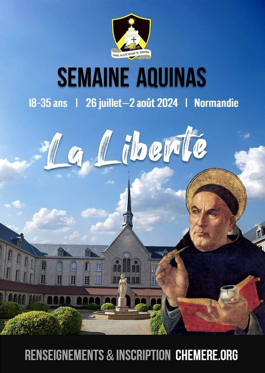 La Semaine Aquinas est une Université d’été qui offre aux étudiants et jeunes pros (jeunes gens et jeunes filles de 18 à 35 ans) une réponse doctrinale aux grandes questions. Elle a lieu du vendredi 26 juillet 2024 (17h00) au vendredi 2 août 2024 (14h00) sur le thème de la liberté.