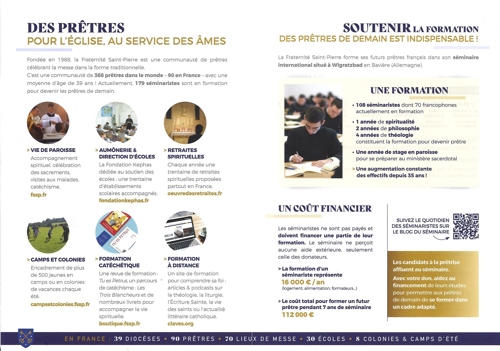 Pendant ce Carême 2024, la Fraternité Saint-Pierre propose de soutenir son action en France mais aussi dans la formation des futurs prêtres. En France, 90 prêtres assurent un ministère dans 39 diocèses, dans 70 lieux de messes ou encore dans 30 écoles…