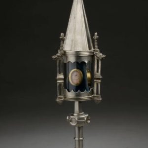Elle recouvre et enchâsse un verre cylindrique abritant trois médaillons reliquaires contenant une très intéressante réunion des reliques des saints hommes de la famille de la Vierge-Marie : son Père Saint Joachim, Saint Zacharie, l’époux de sa cousine Sainte Élisabeth, et leur fils Saint Jean- Baptiste, Précurseur du Christ. Cet exemple permet de rappeler la créativité des ateliers de Poussielgue-Rusand, caractérisé par la variété d’interprétations : une pièce sert de modèle, de prototype, s’agrémente d’ornementations ou s’en allège, puis se conjugue en de multiples variantes de tailles et de métaux. Figurant au catalogue publié en 1893, ce modèle y est présenté avec deux colonnettes, celui-ci lors de cette vente avec trois colonnettes, celui figurant dans le catalogue L’Anjou Religieux, p. 79, présente quatre colonnettes. Les autres petites variantes peuvent être observées« .