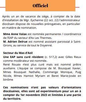 L’an dernier, l’administrateur diocésain a fait paraître quelques nominations, dont celle d’un administrateur d’une équipe d’animation pastorale sans curé (!), le précédent restant tout de même au service de ladite paroisse, au Mas d’Azil.