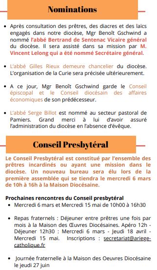 Mgr Gschwind à peine arrivé à la tête du diocèse de Pamiers a fait paraître en février dernier des nominations complémentaires, dont un nouveau vicaire général.