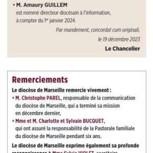 Accueil » Nos archives » Marseille : nouveau délégué diocésain à l’information Informations Marseille : nouveau délégué diocésain à l’information Parue dans le magazine église de Marseille de janvier 2024, la nomination du nouveau délégué diocésain à l’information du diocèse de Marseille, Amaury Guillem : Article précédentMgr Touvet à l'église Saint François de Paule (Toulon) pour le dimanche de la Miséricorde Article suivantFête de l'Annonciation 8 avril 2024