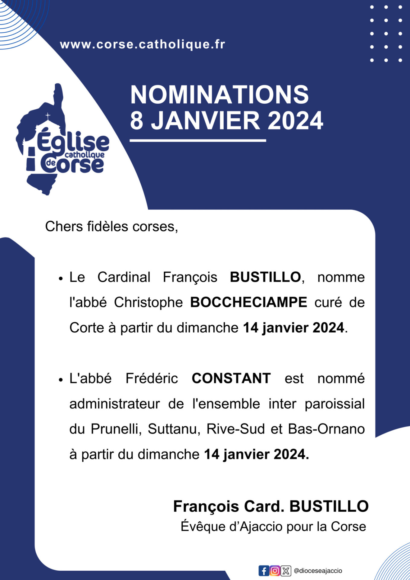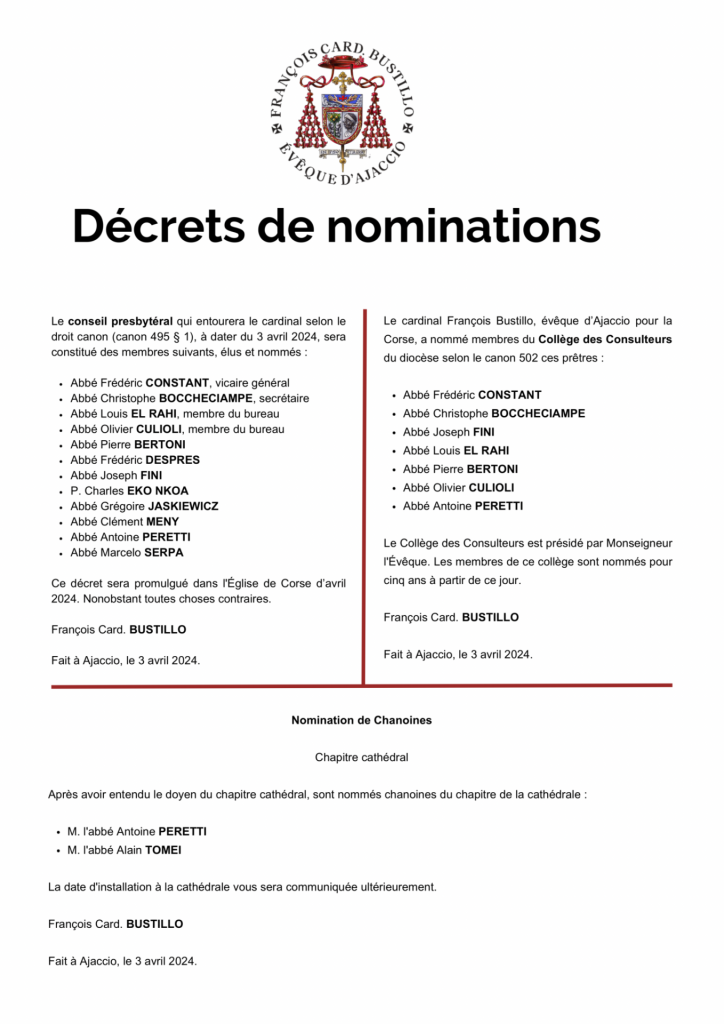 Accueil » Nos archives » Ajaccio : nominations diocésaines complémentaires et nouveau conseil presbytéral Informations Ajaccio : nominations diocésaines complémentaires et nouveau conseil presbytéral Mgr Bustillo a renouvelé le conseil presbytéral du diocèse d’Ajaccio, à partir du 3 avril : Par ailleurs deux curés ont été nommés par le cardinal Bustillo, évêque d’Ajaccio, début 2024 : Article précédentBraderie de Saint Joseph des Lys les 29 et 30 avril Article suivantChangement pour la messe traditionnelle à Rouen 27 avril 2024