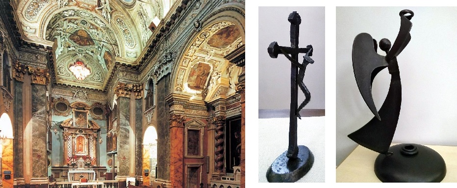A noter que l’intérieur du sanctuaire Notre-Dame du Laghet est une merveille du style baroque niçois, de 1656. Il serait intéressant de savoir comment des objets liturgiques réalisés avec de vieux outils en fer s’harmonisent avec la décoration baroque de l’édifice – question à laquelle le diocèse de Nice se garde bien de répondre dans sa présentation.
