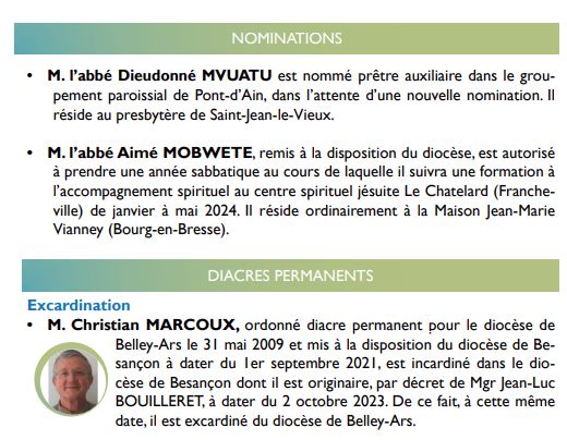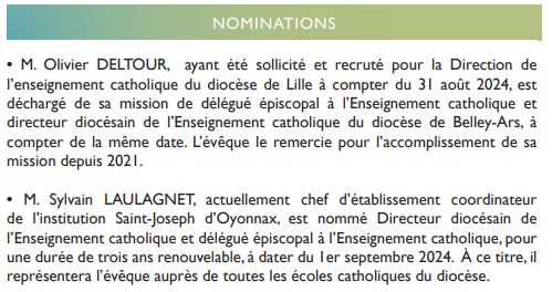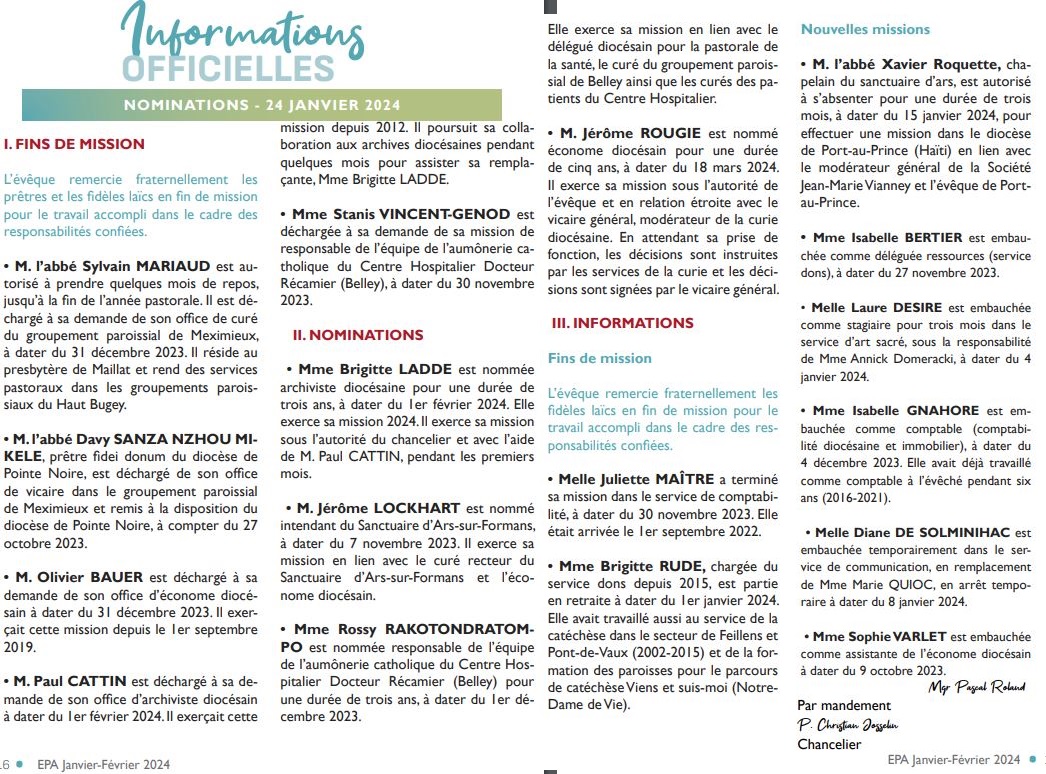 Accueil » Nos archives » Belley-Ars (01) : diverses nominations diocésaines Informations Belley-Ars (01) : diverses nominations diocésaines Outre la nomination d’un nouvel économe arrivé de Rennes, Jérome Rougié, le diocèse de BelleyArs a publié ces derniers mois diverses nominations : En mars 2024 En janvier dernier : En novembre 2023 : Article précédentKermesse de l'Ecole Saint-Dominique (Le Pecq) les 22 et 23 juin Article suivantChartres : nominations diocésaines pour septembre 1 mai 2024