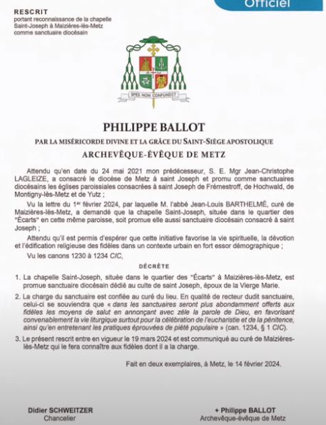 Mgr Ballot a continué l’oeuvre de son prédécesseur Mgr Lagleize – qui en 2021 a consacré le diocèse de Metz à saint Joseph et érigé en sanctuaires diocésains quatre églises à lui consacrées, et a érigé en février dernier la chapelle saint Joseph de Maizières les Metz en sanctuaire diocésain. La cérémonie officielle avait lieu le 17 mars dernier.