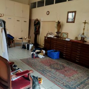 Par ailleurs des artefacts de la pièce posés sur un linge consacré orné d’une belle croix brodée, la sono était sur les marches de l’autel et le synthetiseur juste au pied, la sacristie et le couloir à côté étaient transformés en débarras et vestiaires – sous le regard réprobateur d’une statue du saint curé d’Ars grandeur nature, et le tout en pleine connaissance de cause.