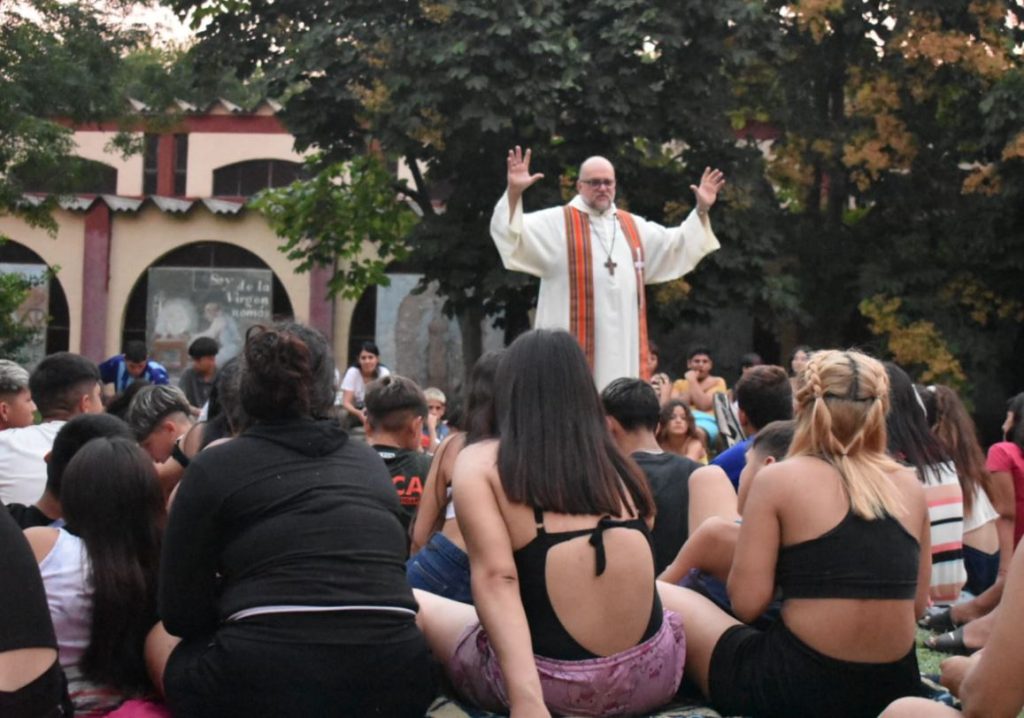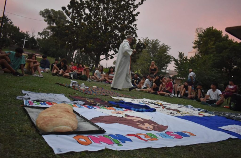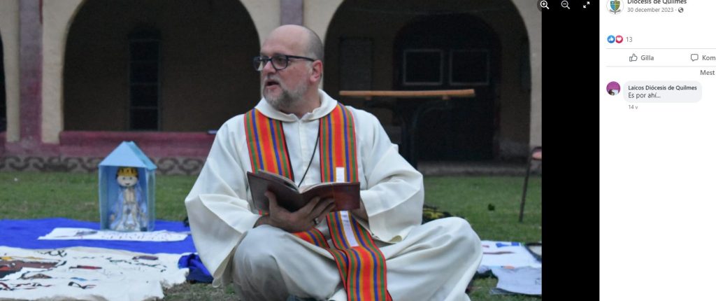 L’évêque auxiliaire Eduardo Redondo Castanera de Quilmes en Argentine – ville connue pour sa bière, mais qui abrite aussi un évêché – a célébré une messe pour un groupe de Caritas assis par terre, avec une peluche représentant la Vierge pour tout mobilier, et une étole multicolore. Une photo de cette messe a été mise sur la page Facebook du diocèse fin décembre dernier – c’est à dire au plus fort de l’été austral, ce qui explique les tenues quelque peu dévêtues de l’assistance A côté de lui, sur un drap, un calice en métal et un grand pain sans levain. Il ne semble même pas y avoir de croix…