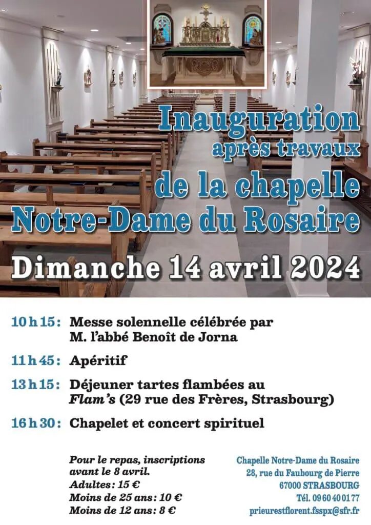 Après des travaux, la chapelle Notre-Dame du Rosaire, chapelle de la Fraternité Saint-Pie X à Strasbourg, sera inaugurée à l’occasion du messe solennelle célébrée par l’abbé Benoit de Jorna, Supérieur du District de France de la Fraternité Saint-Pie X.